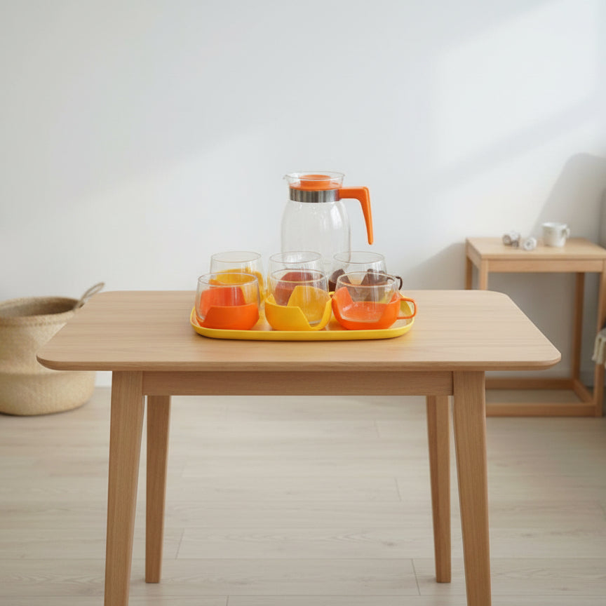 Bring a burst of vintage charm to your table with this vibrant 70’s glass drinkware set. Featuring bold retro colors in orange, yellow, red, and purple with its original plastic holder. The set includes six cups along with a matching pitcher.