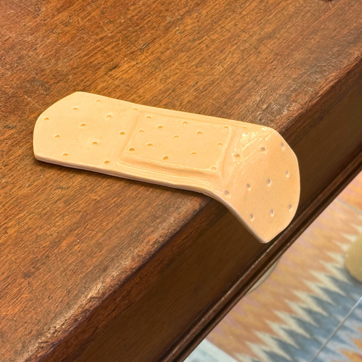Did your bookshelf hurt itself? Does your side table need help with a bad scrape? We have just the thing! A ceramic sculpture of a ceramic bandaid, of course! No more boo boos.