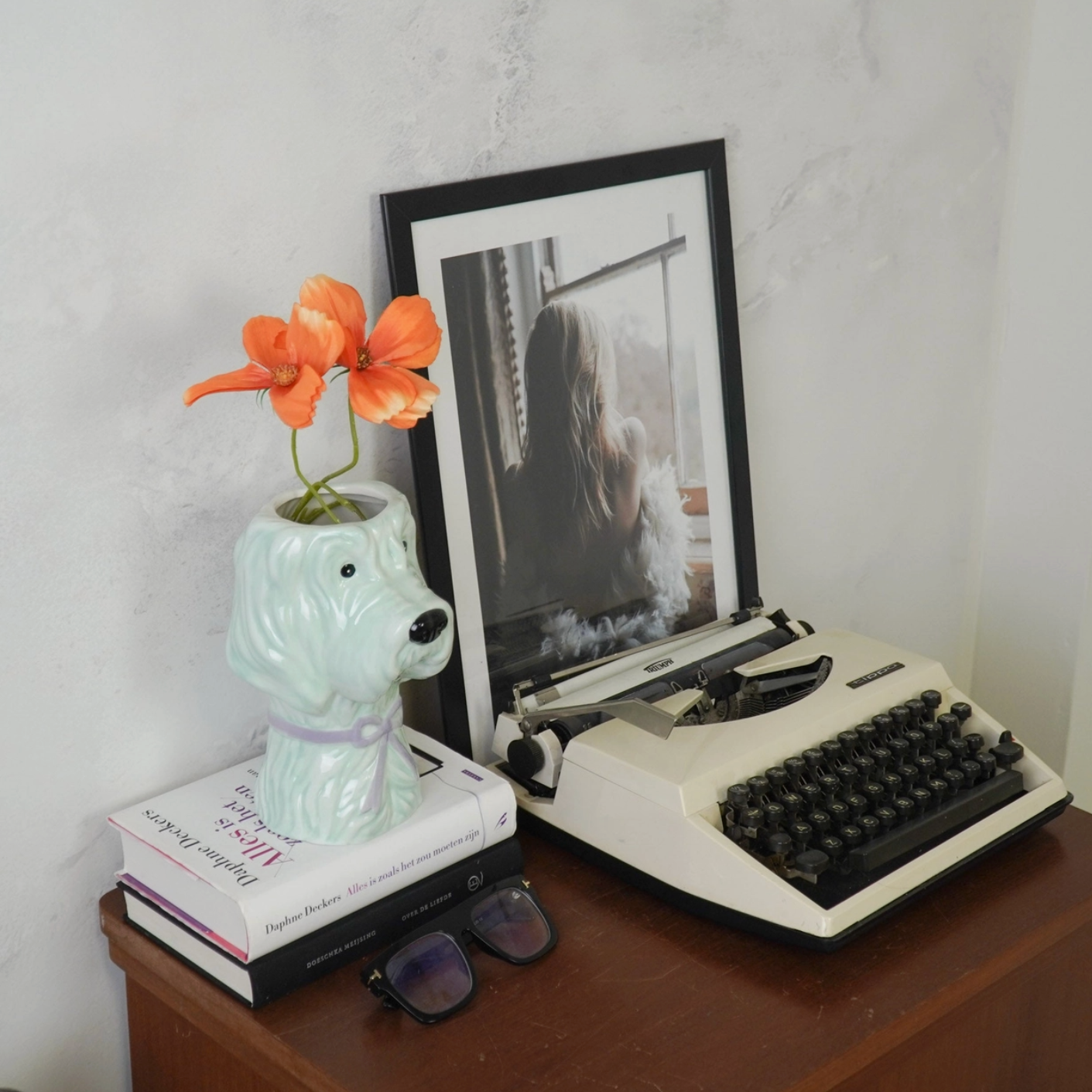 This absolutely precious pupoy vase is basically what happens when mid-century kitsch meets unconditional ceramic love! That fluffy mint-green shaggy coat with those sweet button eyes and that tiny pink tongue peeking out? It's giving major "I'm your grandmother's most treasured figurine but make it functional" energy. Your succulents are about to have the cutest roommate ever!
