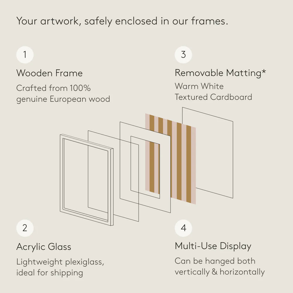 Made in the European Union using sustainably sourced wood and acrylic. Light and easy to hang. All that is left now is picking the perfect print to go in it.