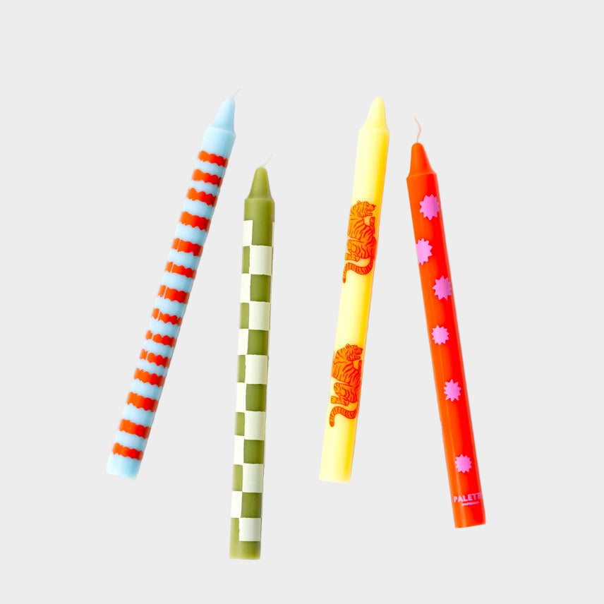 Bright, bold and full of fun. Made to bring joy and celebration! With playful patterns and vibrant tones of green, orange, yellow, and blue, this set of four taper candles adds a creative twist to your table or party décor.
