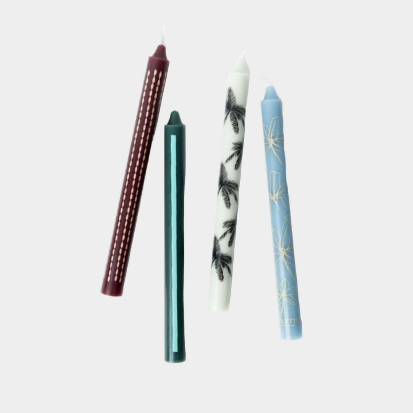 A set of 4 candles with rich hues reminiscent of golden sunsets in a deep green jungle. Spice up your candlesticks!