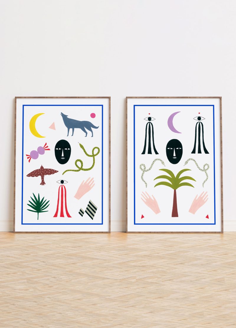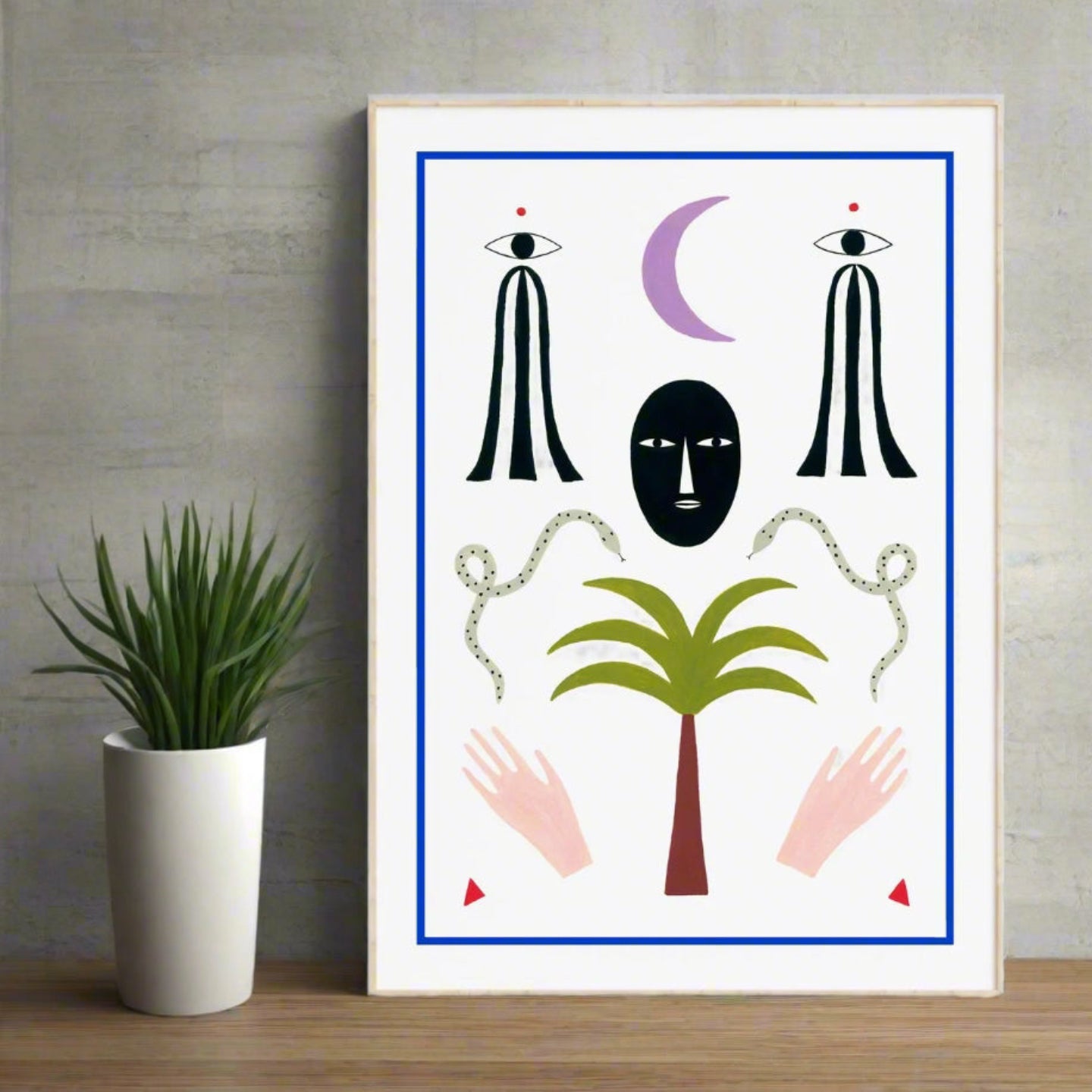 A mystical print with totems around the moon - a little magical piece to fill your walls with good vibes. By Spanish illustrator Verónica de Arriba.