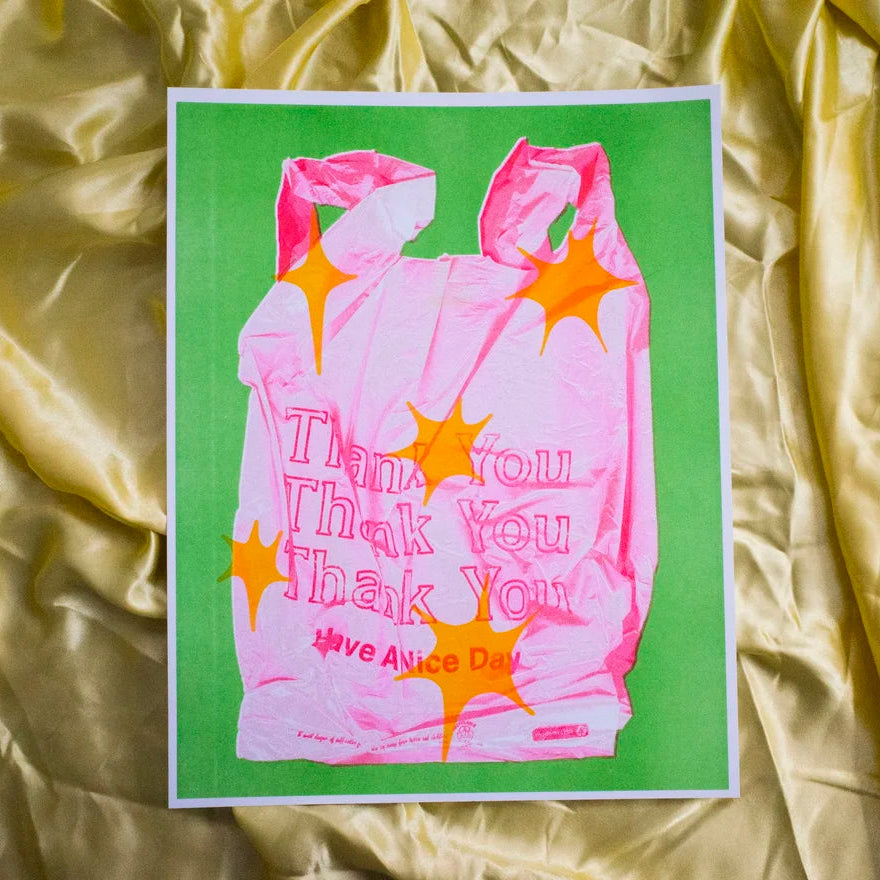 A playful and nostalgic print featuring the iconic red plastic bag design that says “thank you have a nice day”. Set against a vibrant green background, this piece turns an everyday object into pop art. Perfect for adding a touch of irony.
