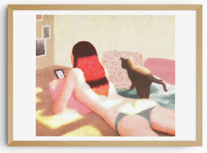 A sun drenched print of a woman lazing around, catching up on texts, hanging out with her cat. Our kind of morning.